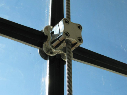 點支撐玻璃幕墻:整個結構體系由張拉索/桿、不銹鋼撐桿及玻璃連接爪件等組成。幕墻整體通透感較強,支撐體系簡潔大方,具有極強的裝飾功能。